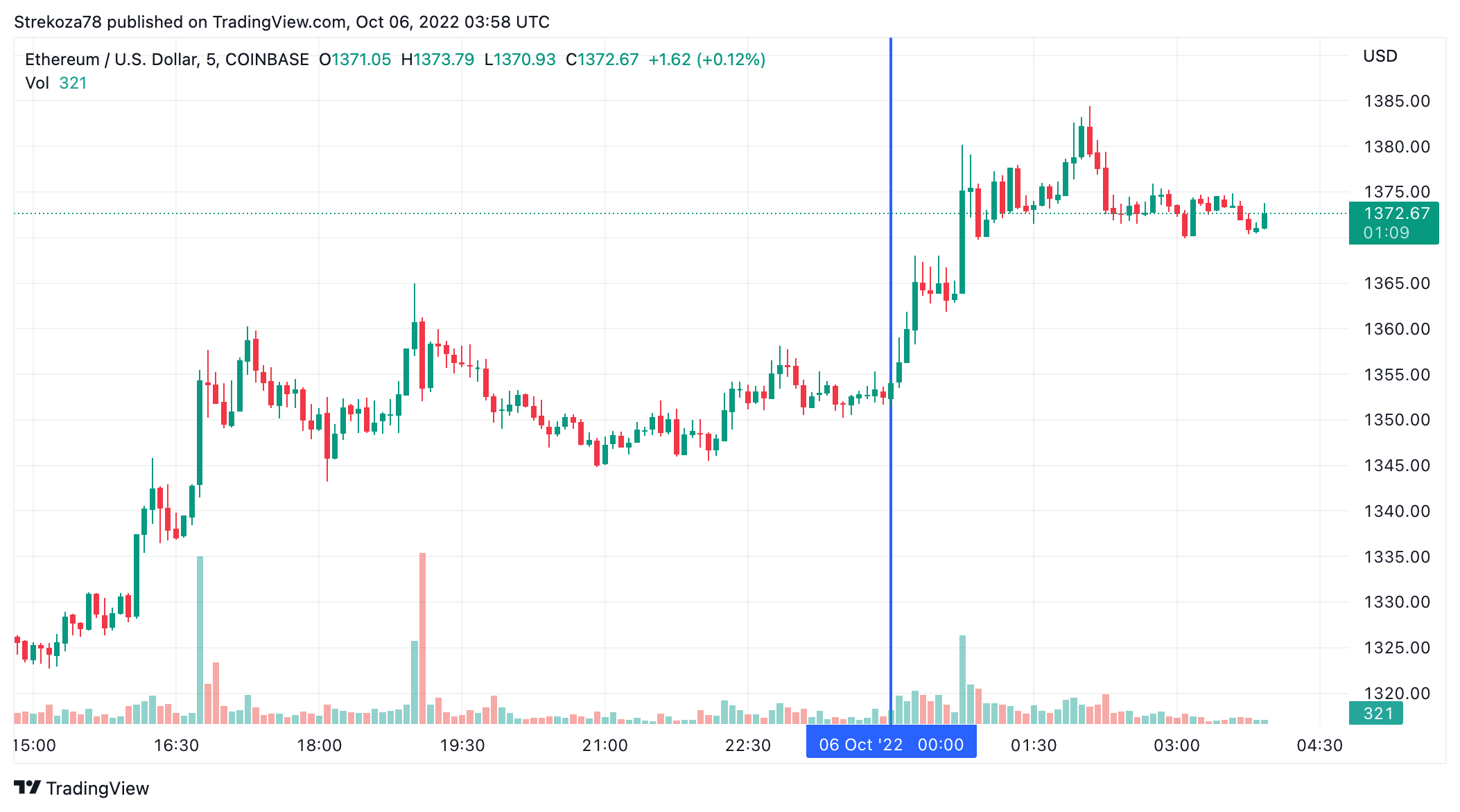 Вторая по капитализации криптовалюта Ethereum движется по направлению к $1 400. ETH/USD за сутки в плюсе на 1,2%, По состоянию на момент написания обзора монета торгуется по $1 372 (1 токен в рублях – ₽83 503).