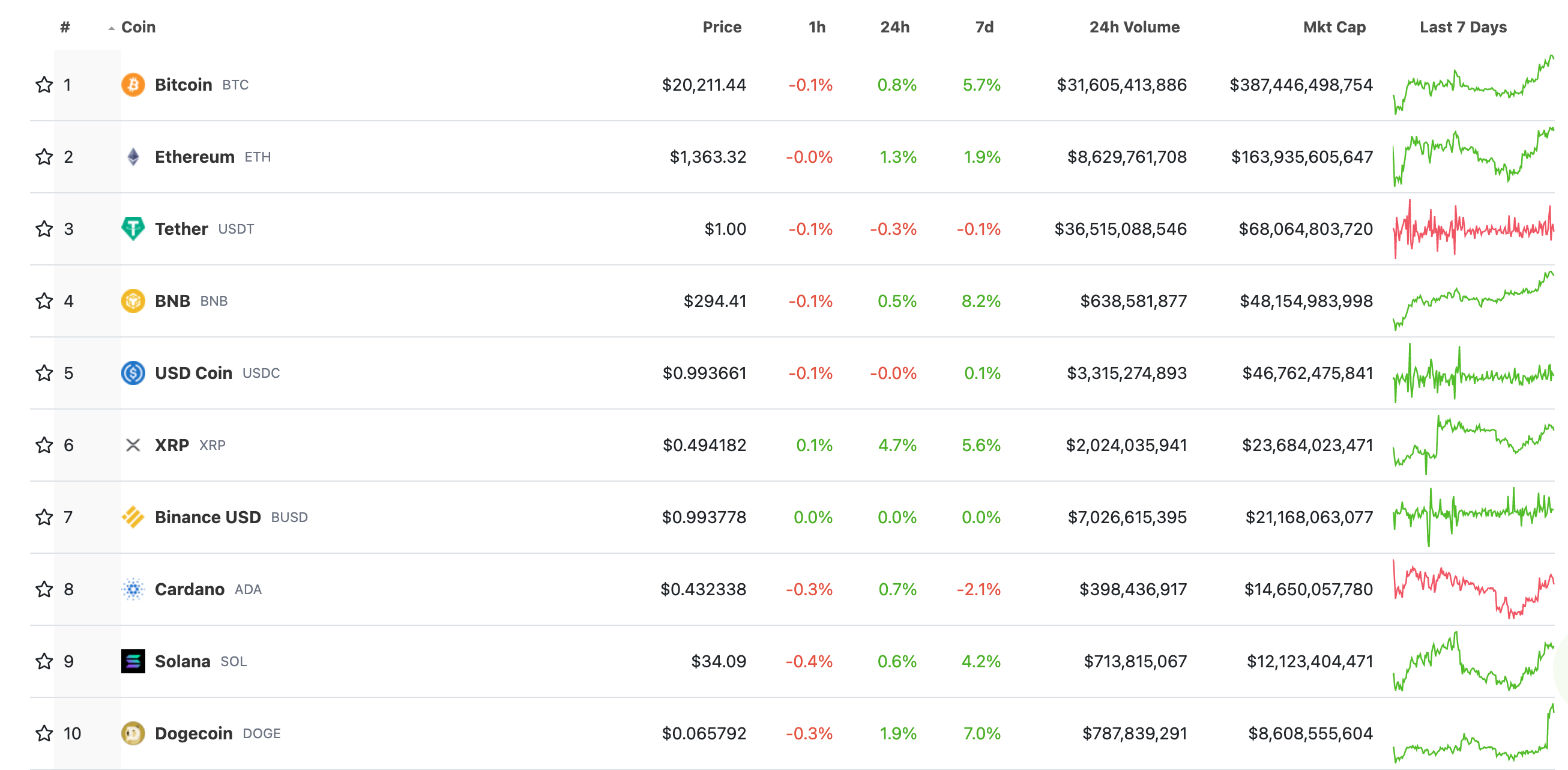 В топ-10 самых капитализированных криптовалют лучшая динамика за сутки (+4,7%) у Ripple (XRP), за неделю — у Dogecoin (DOGE) (+7%). Наибольшие потери в недельном исчислении у Cardano (ADA). Монета подешевела на 2,1%.