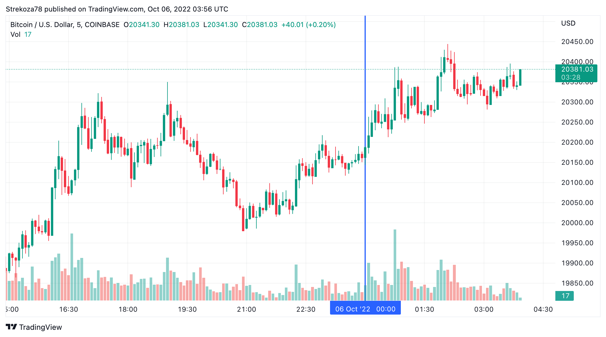 Курс биткоина (BTC) продолжает восстанавливаться после падения ниже $20 000 На момент публикации криптовалюта торгуется на уровне $20 380. За сутки курс криптовалюты практически не изменился (1 токен в рублях – ₽1 236 756).