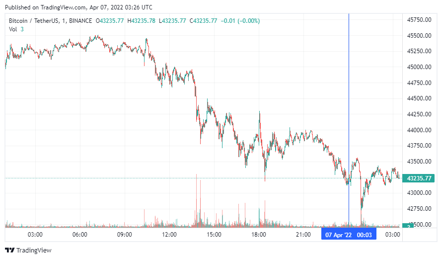 Биткоин (BTC) начал четверг с падения. По состоянию на 06:26 (МСК), криптовалюта торгуется по $43 235. Минимум стоимости монеты за 24 часа, по данным ресурса CoinMarketCap, зафиксирован на уровне $42 899, максимум – на высоте $45 501.