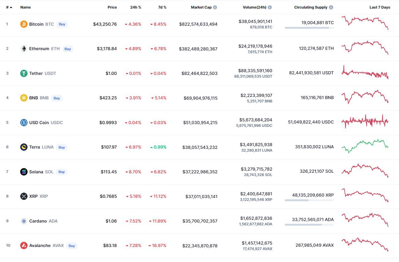 Все криптовалюты из топ-10 капитализации, за исключением Terra, которая выросла на 0,99% за неделю, продемонстрировали отрицательную динамику движения в рамках 24 часов и последних семи дней. Наибольшие потери за сутки зафиксированы у Solana (-8,70%). В рамках семи дней активнее других терял в цене Avalanche (-16,97%).