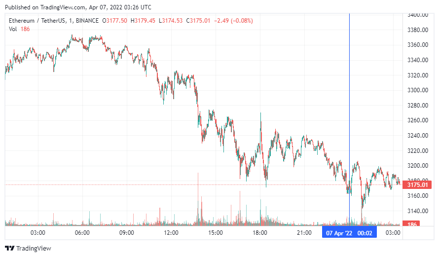 Вторая по капитализации криптовалюта Ethereum также начала день с падения. По состоянию на момент написания новости, монета торгуется по $3175.