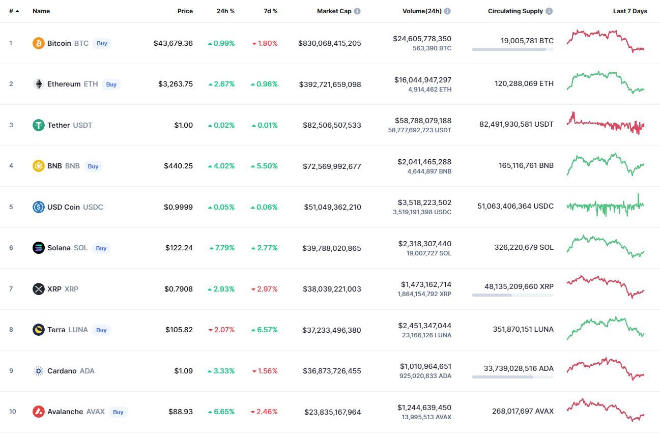 В топ-10 самых капитализированных криптовалют лучший результат за 24 часа зафиксирован у Solana (+7,79%), за неделю – у Terra (+6,57%). При этом монета активнее других теряла в цене в течение суток (-2,07%). В рамках недели наибольшие потери зафиксированы у XRP (-2,97%).