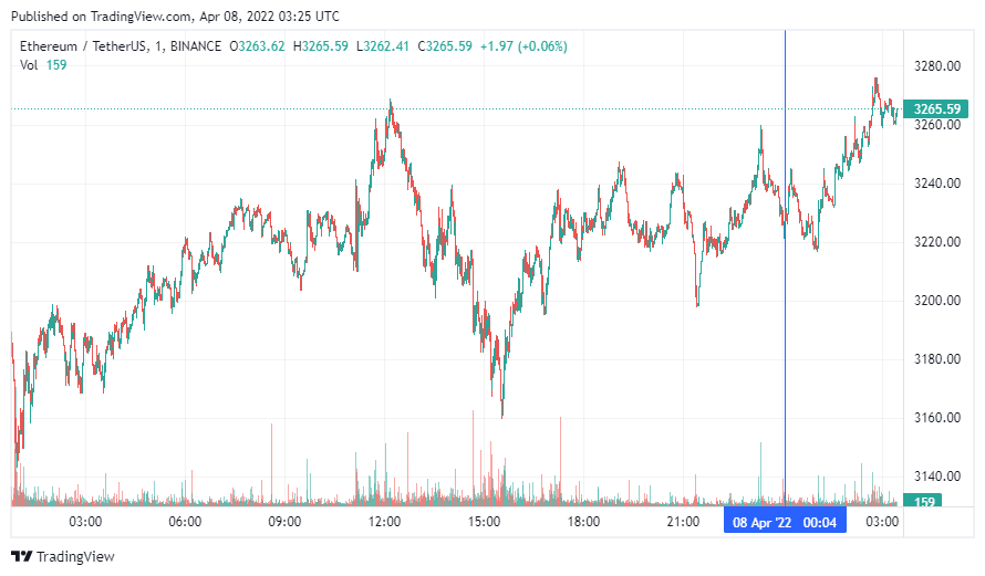 Вторая по капитализации криптовалюта Ethereum начала день с небольшого роста. Минимум монеты за 24 часа зафиксирован на уровне $3168, максимум – на высоте $3269.