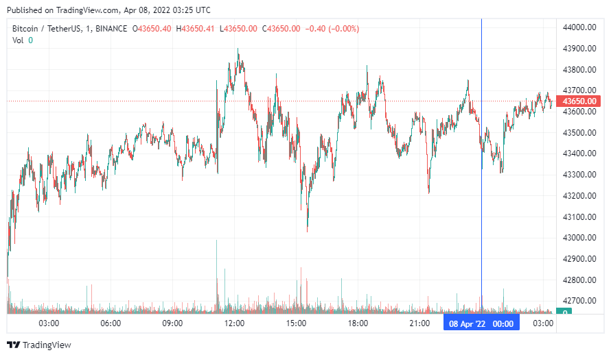 Биткоин (BTC) начал пятницу с небольшого роста в рамках бокового движения. По состоянию на 06:26 (МСК), криптовалюта торгуется по $43 650. Минимум стоимости монеты за 24 часа, по данным ресурса CoinMarketCap, зафиксирован на уровне $43 146, максимум – на высоте $43 860.