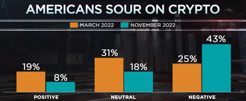 Количество негативно настроенных в отношении криптовалют американцев с марта 2022 года подскочило с 25% до 42%. Группа нейтрально настроенных в отношении криптовалют американцев, по данным аналитиков, уменьшилась почти вдвое. Исследование CNBC датировано концом ноября. В этом месяце некогда крупнейшая криптобиржа FTX подала на банкротство.