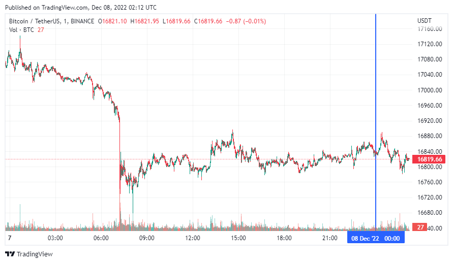 Биткоин (BTC), по данным ресурса CoinMarketCap, начал четверг с небольшого снижения. По состоянию на 05:13 (МСК), криптовалюта торгуется по $16 819 (1 токен в рублях – ₽1,051,996). Минимум биткоина за 24 часа – $16,750, максимум – $17,061.