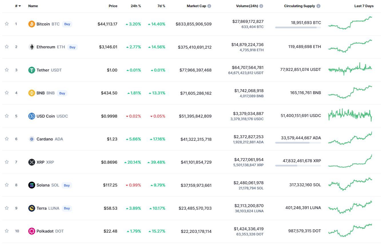 В топ-10 самых капитализированных криптовалют лучший результат за 24 часа (+20,14%) и неделю (+39,48%) зафиксирован у XRP. В рамках суток единственной монетой, которая теряла в цене, оказалась Solana (-0,99%). В течение недели все монеты, за исключением стейблкоина USD Coin, демонстрировали позитивную динамику движения.