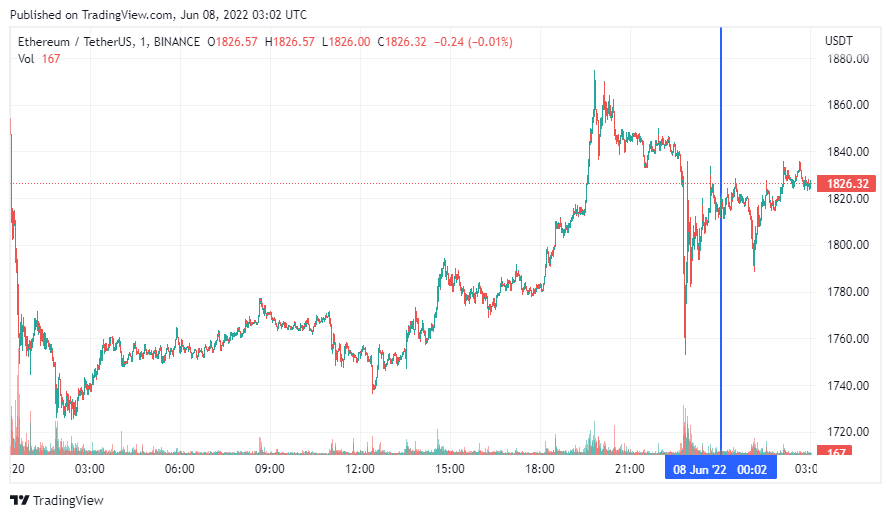 Вторая по капитализации криптовалюта Ethereum также начала день с небольшой коррекции. По состоянию на момент написания новости, монета торгуется по $1826.