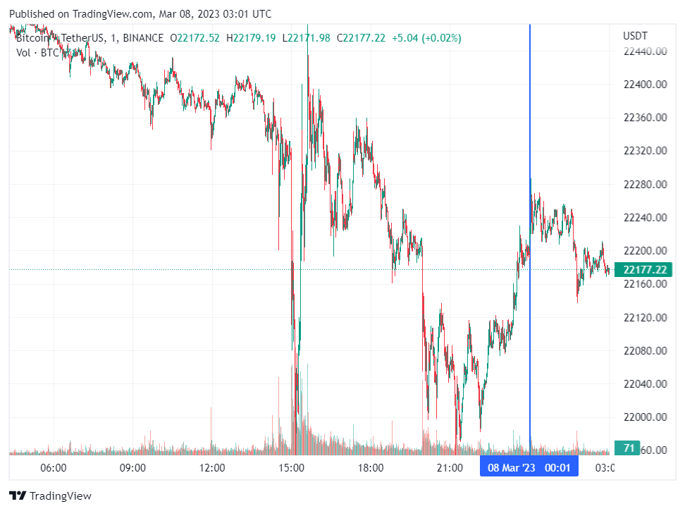 Биткоин (BTC), по данным ресурса CoinMarketCap, начал среду с небольшой коррекции. По состоянию на 06:02 (МСК), криптовалюта торгуется по $22 177 (1 токен в рублях — ₽1,678,650). Минимум биткоина за 24 часа — $22 011, максимум — $22 527.