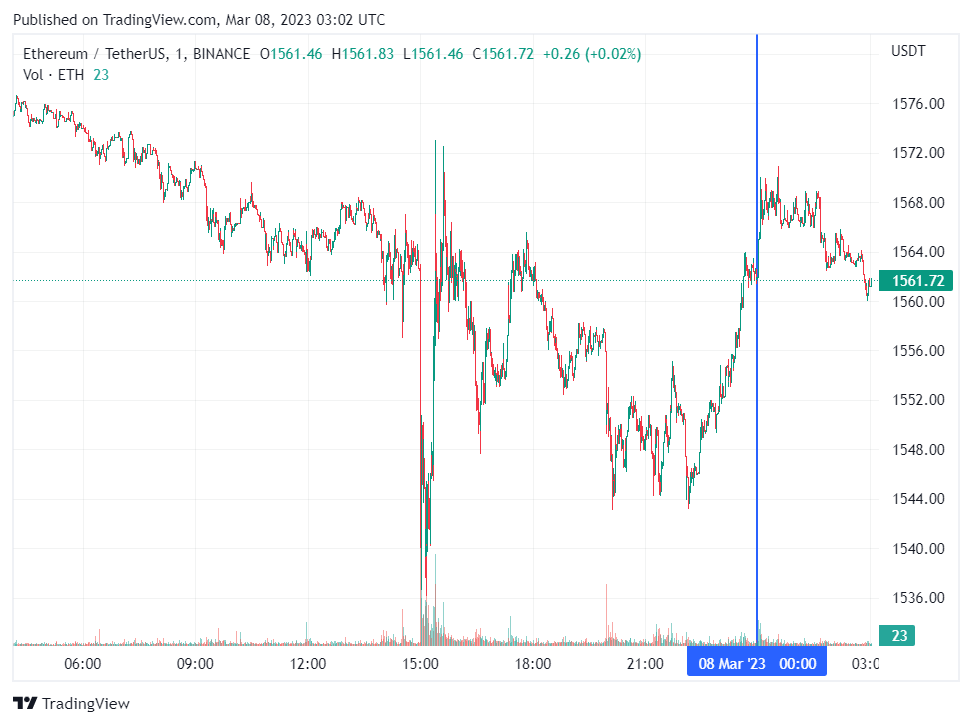 Вторая по капитализации криптовалюта Ethereum также начала день с коррекции. По состоянию на момент написания обзора, монета торгуется по $1561 (1 токен в рублях — ₽118,087).