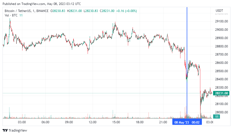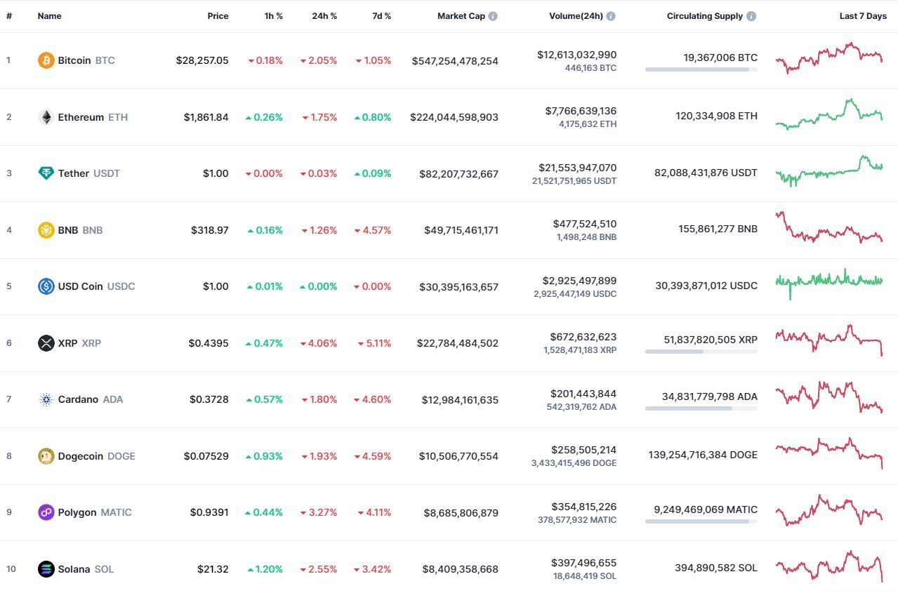 Биткоин (BTC), по данным ресурса CoinMarketCap, начал пятницу с падения. По состоянию на 06:18 (МСК), криптовалюта торгуется по $28 231 (1 токен в рублях — ₽2,195,995). Минимум биткоина за 24 часа — $28 133, максимум — $29 119.
