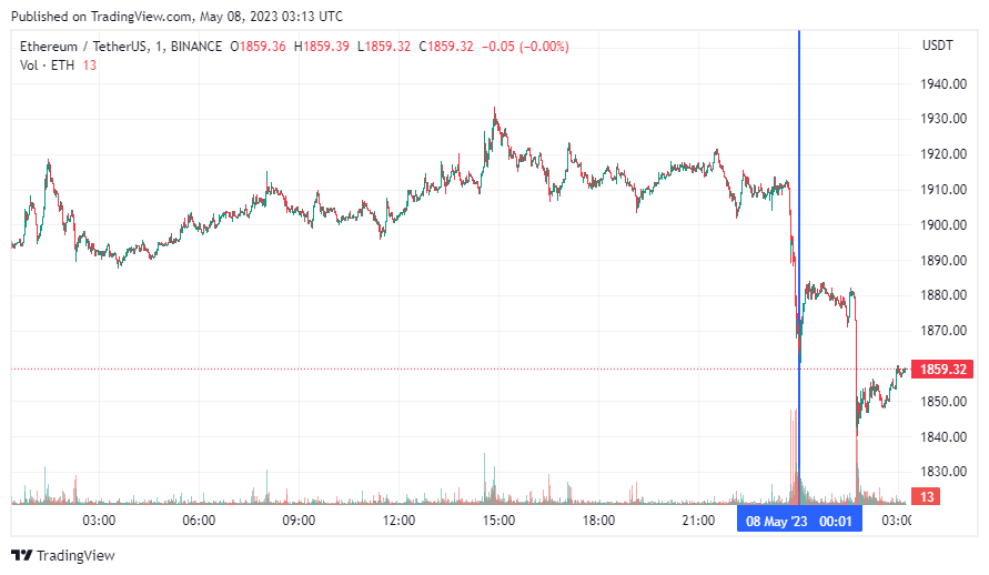 Вторая по капитализации криптовалюта Ethereum также начала день с падения. По состоянию на момент написания обзора, монета торгуется по $1859 (1 токен в рублях — ₽144,664).