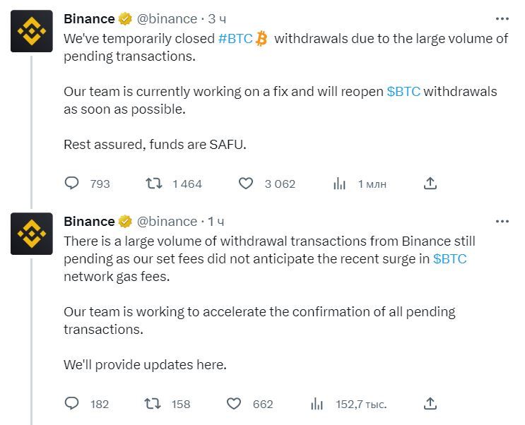 Главная причина приостановки вывода — большое количество транзакций в очереди на обработку. Команда криптобиржи утверждает, что функционал будет восстановлен в ближайшее время. Чтобы предотвратить повторение ситуации, представители Binance скорректировали комиссии за вывод.