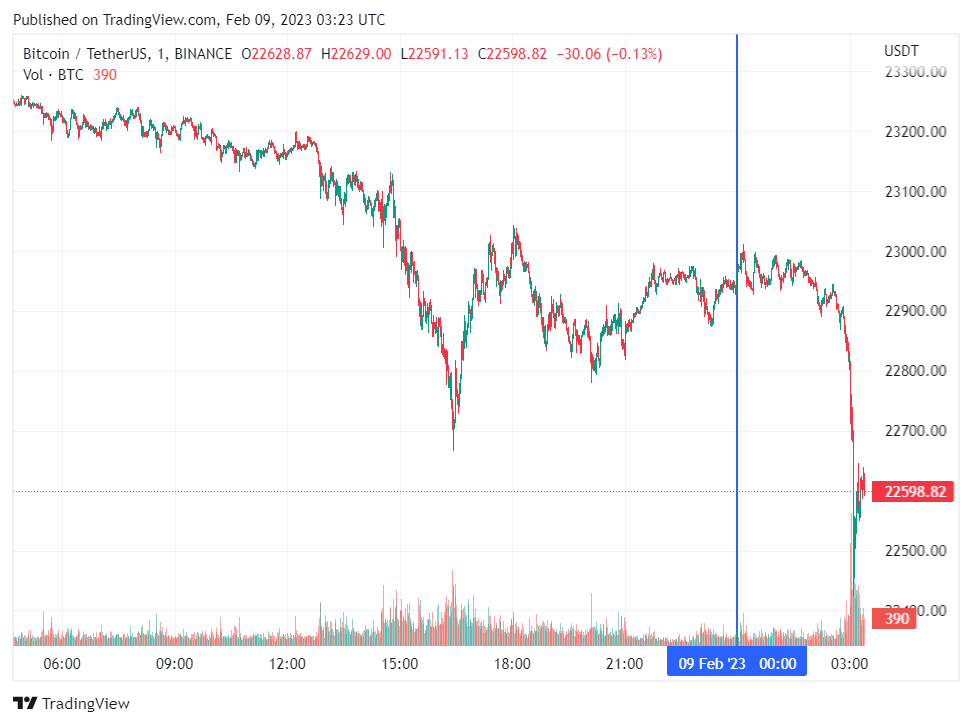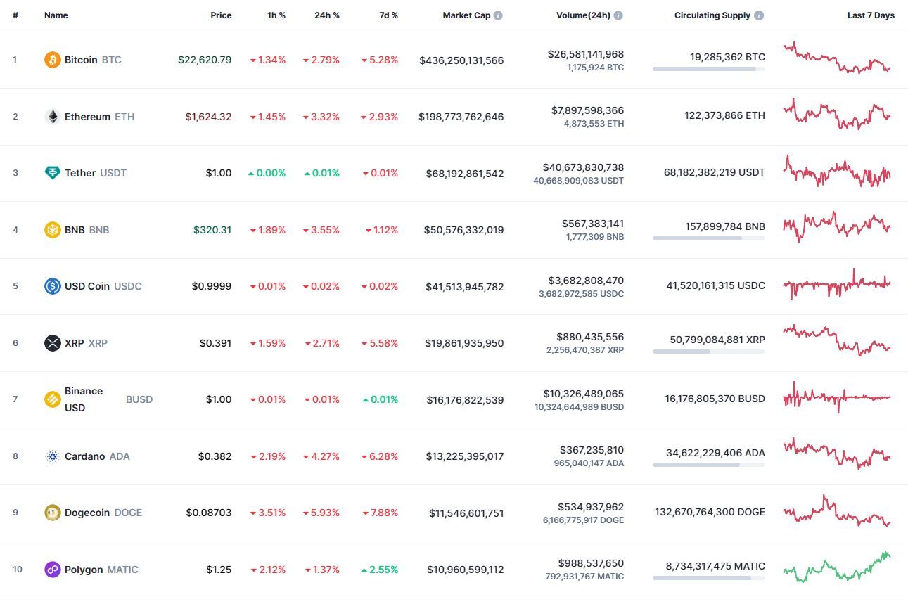 Биткоин (BTC), по данным ресурса CoinMarketCap, начал четверг с падения. По состоянию на 06:24 (МСК), криптовалюта торгуется по $22 598 (1 токен в рублях – ₽1,628,654). Минимум биткоина за 24 часа – $22 568, максимум – $23 287.