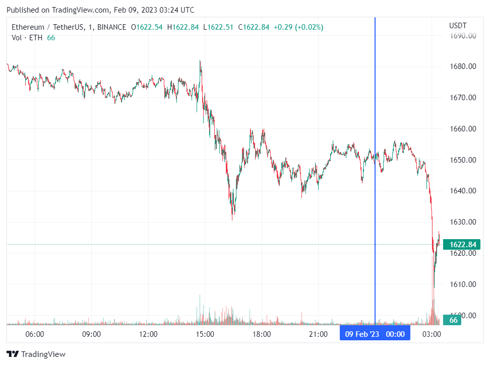 Вторая по капитализации криптовалюта Ethereum также начала день с падения. По состоянию на момент написания обзора, монета торгуется по $1622 (1 токен в рублях – ₽116,925).