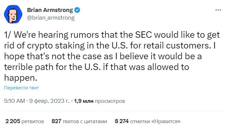 Брайан Армстронг считает, что стейкинг не несет никаких угроз. Бизнесмен призвал власти США прояснить нормы регулирования, чтобы предупредить появление подобных слухов и открыть возможность использования новых технологий в интересах страны. В случае ввода запрета, отметил Армстронг, криптокомпаниям, которые предоставляют доступ к стейкингу, по его мнению, потребуется переезд в другие страны.