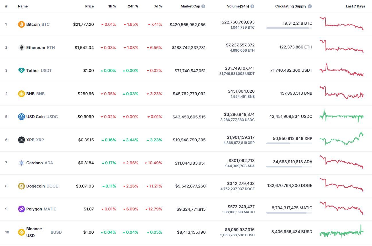 Биткоин (BTC), по данным ресурса CoinMarketCap, начал четверг с бокового движения. По состоянию на 06:22 (МСК), криптовалюта торгуется по $21 775 (1 токен в рублях — ₽1,655,144). Минимум биткоина за 24 часа — $21 692, максимум — $22 198.