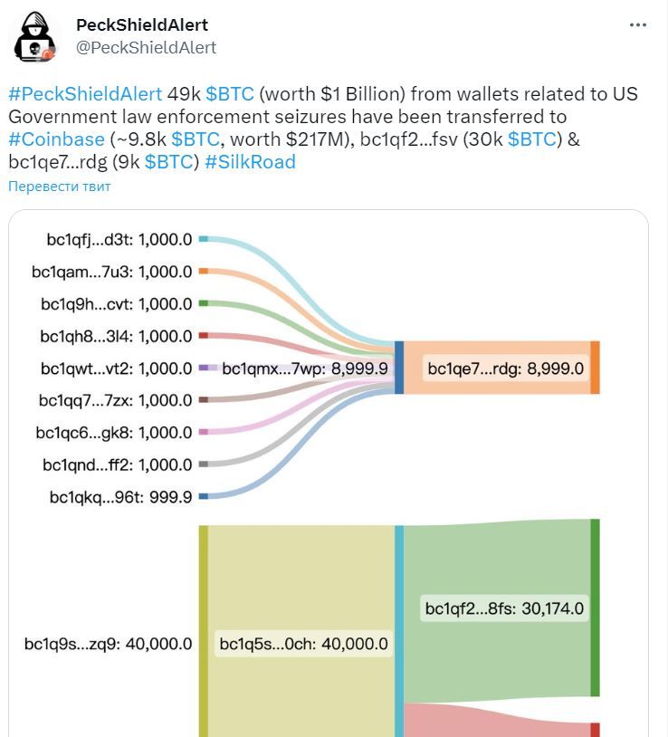 - Конфискованные у даркнет-маркетплейса Silk Road 48 998 биткоины на $1 млрд пришли в движение. Часть монет, общей суммой в $217 млн, перевели на криптобиржу Coinbase. Об этом сообщили аналитики PeckShield.