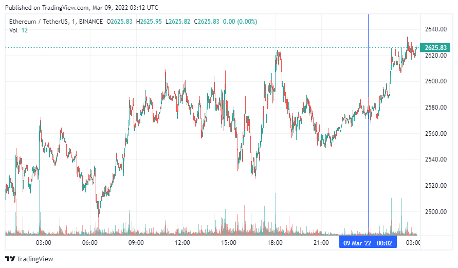 Вторая по капитализации криптовалюта Ethereum, по состоянию на момент написания новости, торгуется по $2625. Монета также начала среду с роста.