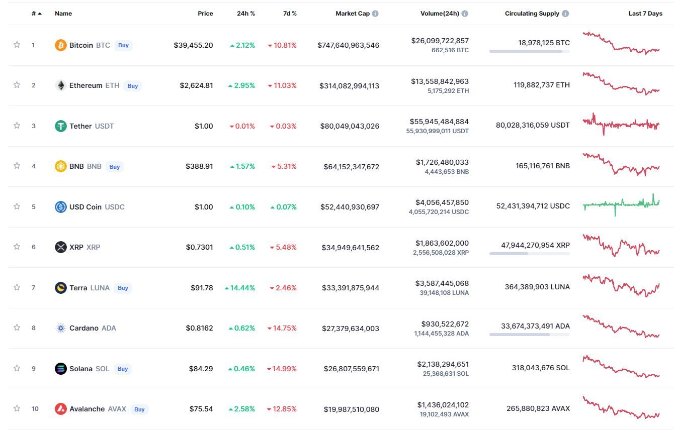 В топ-10 самых капитализированных криптовалют лучший результат за 24 часа зафиксирован у Terra (+14,44%). В рамках недели все монеты, за исключением стейблкоина USD Coin, теряли в цене. Наибольшие потери зафиксированы у Solana (-14,99%).