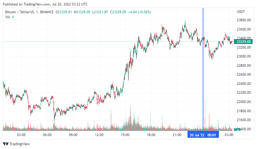 Биткоин (BTC), по данным ресурса CoinMarketCap, начал среду с бокового движения. По состоянию на 06:22 (МСК), криптовалюта торгуется по $23 329. Минимум стоимости монеты за 24 часа зафиксирован на уровне $21 683, максимум – на высоте $23 666.
