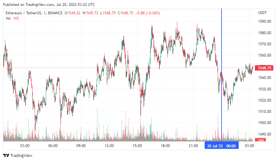 Вторая по капитализации криптовалюта Ethereum начала день с небольшого роста после коррекции. По состоянию на момент написания новости, монета торгуется по $1548.