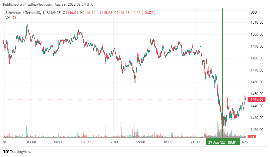 Вторая по капитализации криптовалюта Ethereum также начала день с бокового движения. По состоянию на момент написания обзора монета торгуется по $1445 (1 токен в рублях – ₽87,178).