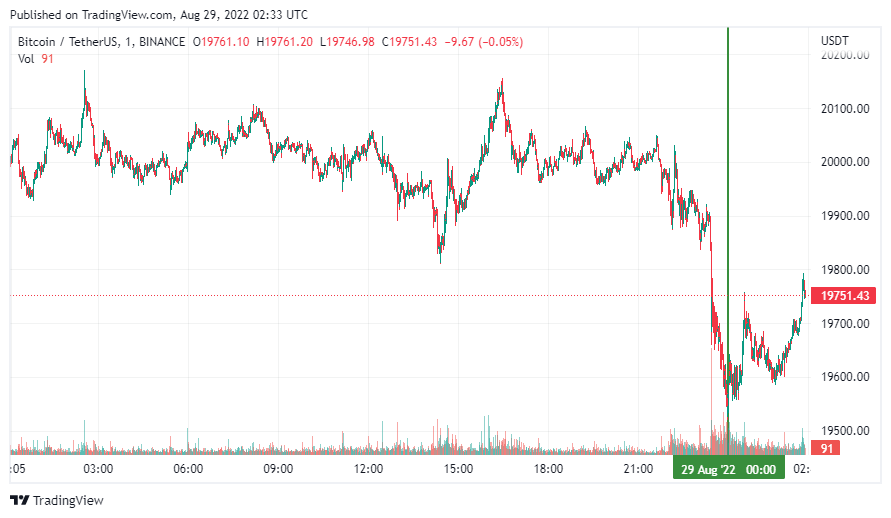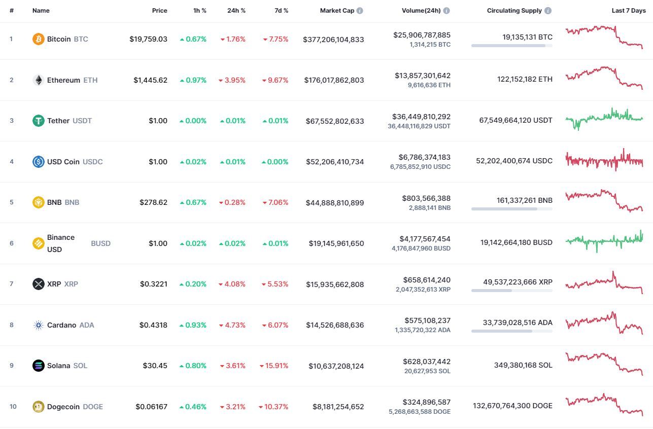 Биткоин (BTC), по данным ресурса CoinMarketCap, начал новую рабочую неделю с бокового движения. По состоянию на 05:34 (МСК), криптовалюта торгуется по $19 751 (1 токен в рублях – ₽1,191,469). Минимум биткоина за 24 часа – $19 600, максимум – $20 139.
