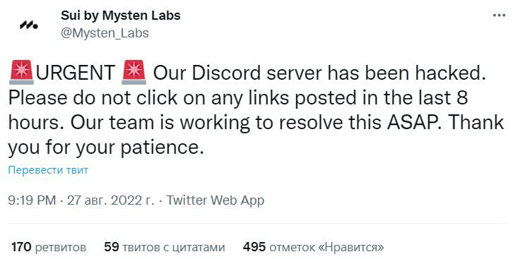 - Мошенники взломали сервер Discord-канала компании Mysten Labs – создателя блокчейн-проекта Sui. Информация об этом появилась в микроблоге разработчиков.
