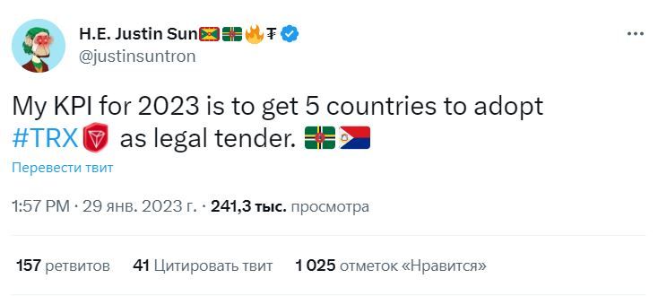 - Основатель популярного криптопроекта TRON Джастин Сан хочет добиться принятия своей криптовалюты TRX в пяти странах в течение 2023 года. Своими планами он поделился с читателями микроблога.