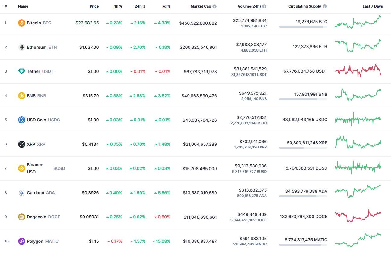 Биткоин (BTC), по данным ресурса CoinMarketCap, начал день с небольшой коррекции после обновления максимума за полгода. По состоянию на 06:50 (МСК), криптовалюта торгуется по $23 679 (1 токен в рублях – ₽1,675,728). Минимум биткоина за 24 часа – $23 175, максимум – $23 919.