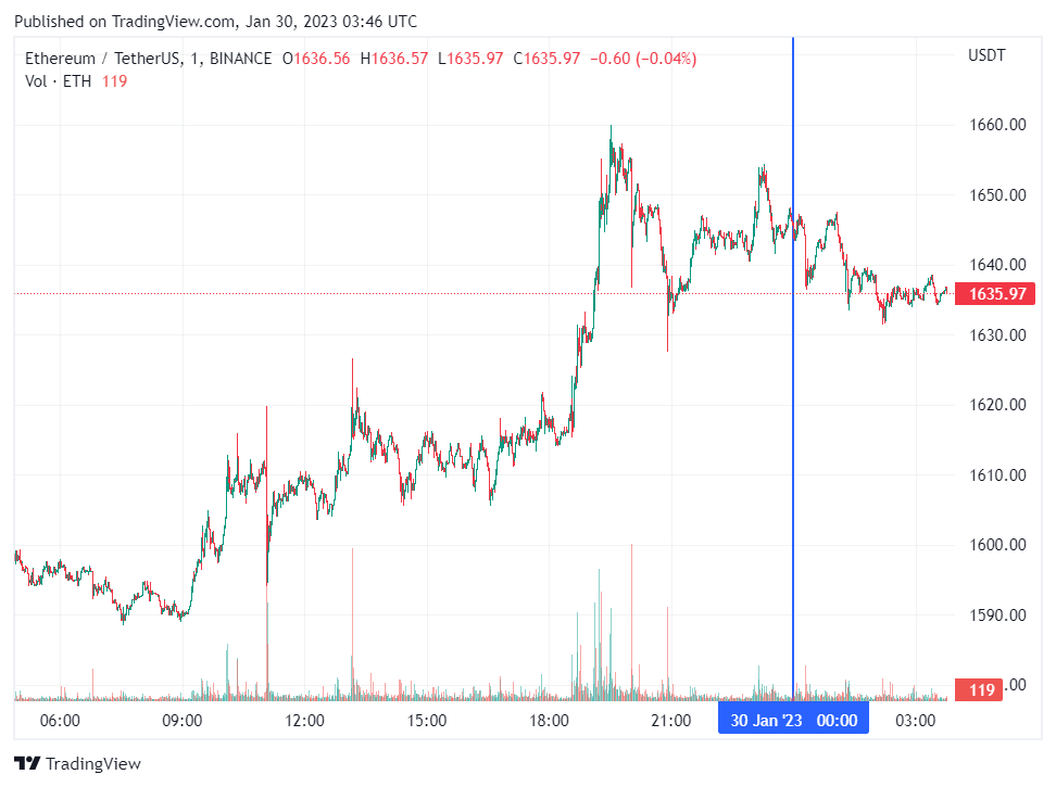 Вторая по капитализации криптовалюта Ethereum также начала день с коррекции. По состоянию на момент написания обзора, монета торгуется по $1635 (1 токен в рублях – ₽115,803).