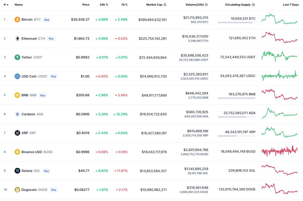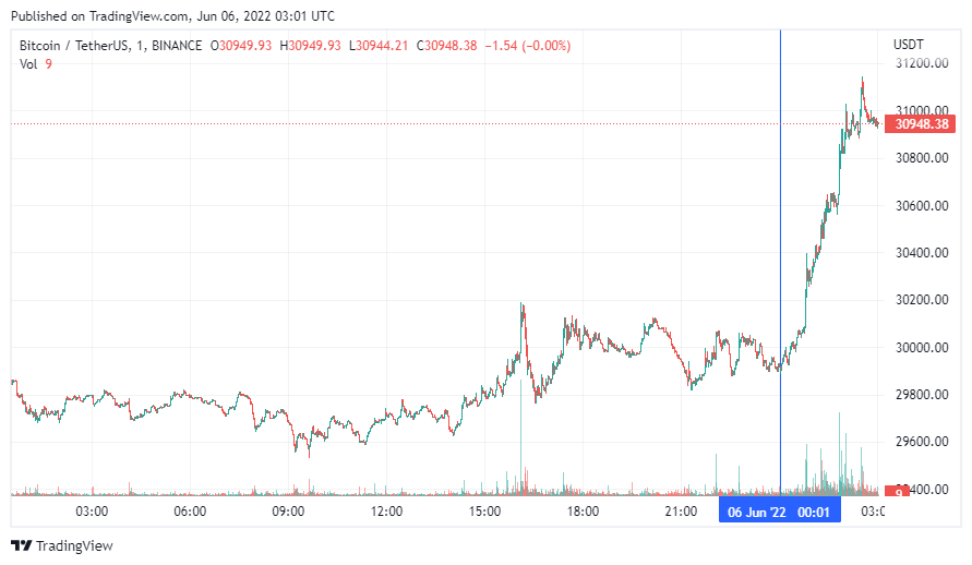 Биткоин (BTC) начал понедельник с роста. По данным ресурса CoinMarketCap, по состоянию на 06:02 (МСК), криптовалюта торгуется по $30 948. Минимум стоимости монеты за 24 часа зафиксирован на уровне $29 574, максимум – на высоте $31 049.