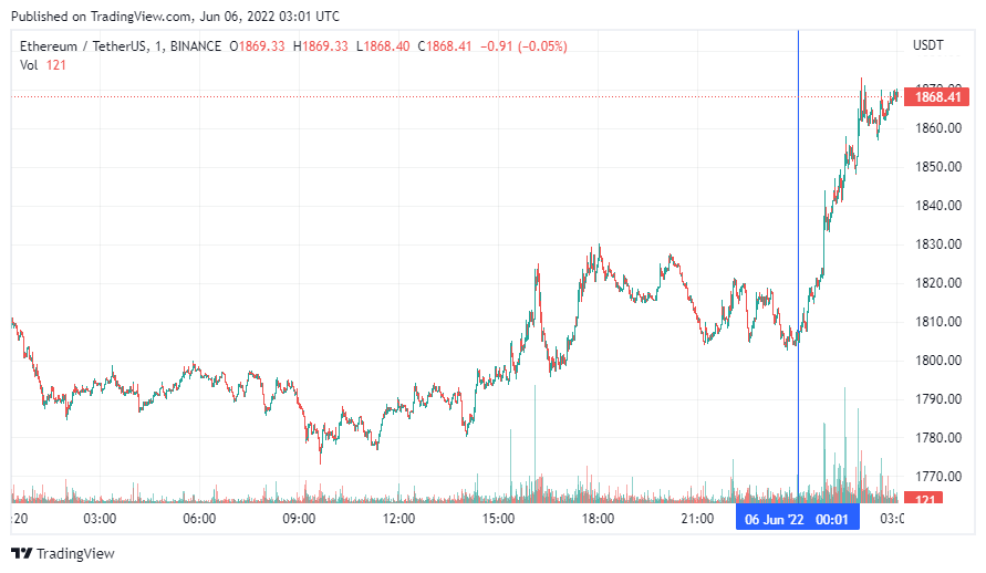 SponsoredВторая по капитализации криптовалюта Ethereum также начала день с роста. По состоянию на момент написания новости, монета торгуется по $1868.
