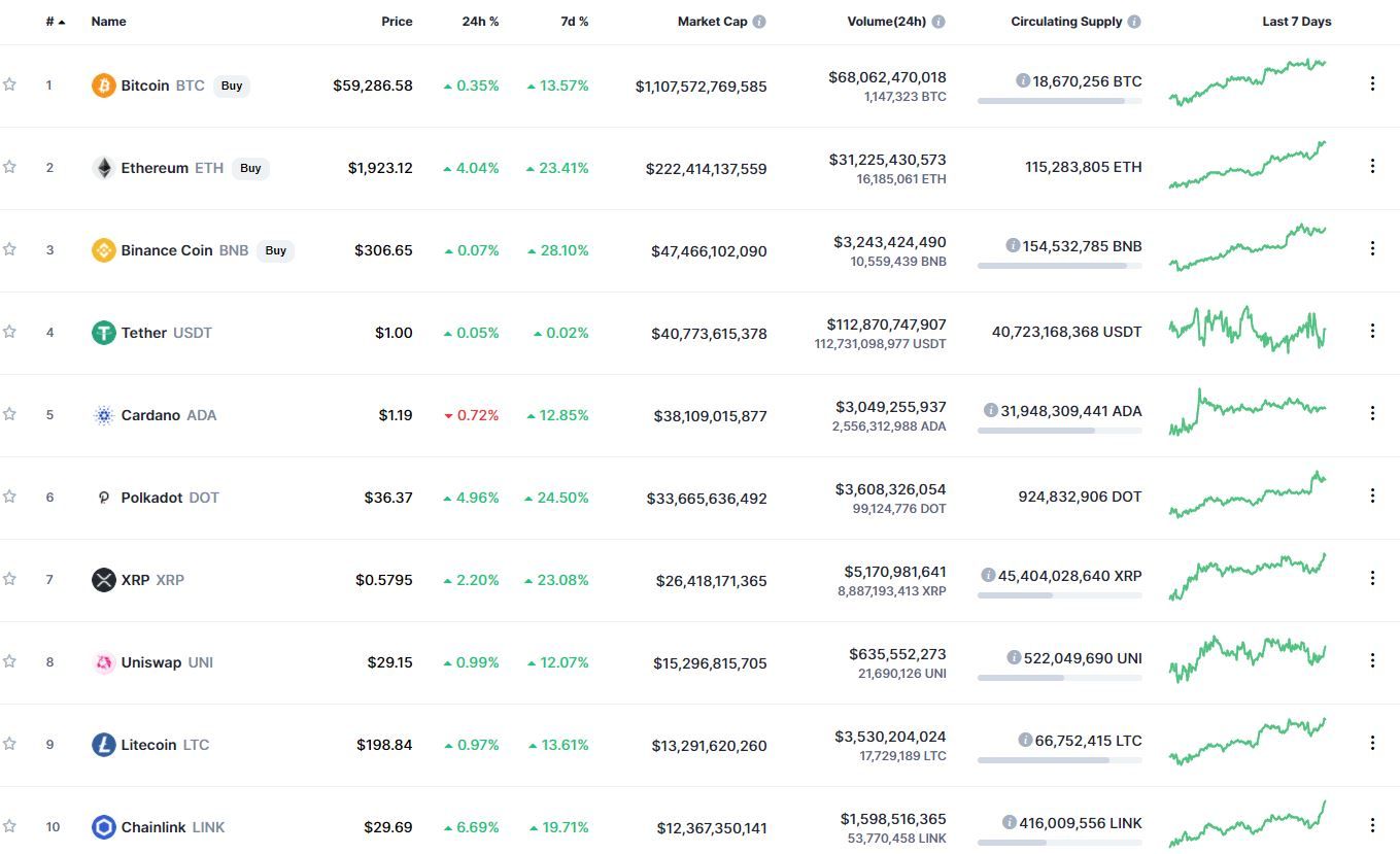 Самая капитализированная криптовалюта – биткоин – начала четверг с небольшого роста. По состоянию на 06:30 (МСК), по данным CoinMarketCap, монета торгуется по $59 286. За сутки биткоин подорожал на 0,35%, за неделю – на 13,57%.