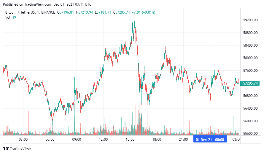 Биткоин (BTC) начал декабрь с бокового движения. По состоянию на 06:12 (МСК), криптовалюта торгуется по $57 205. Минимум стоимости монеты за 24 часа, по данным ресурса CoinMarketCap, зафиксирован на уровне $56 375, максимум – на высоте $58 879.