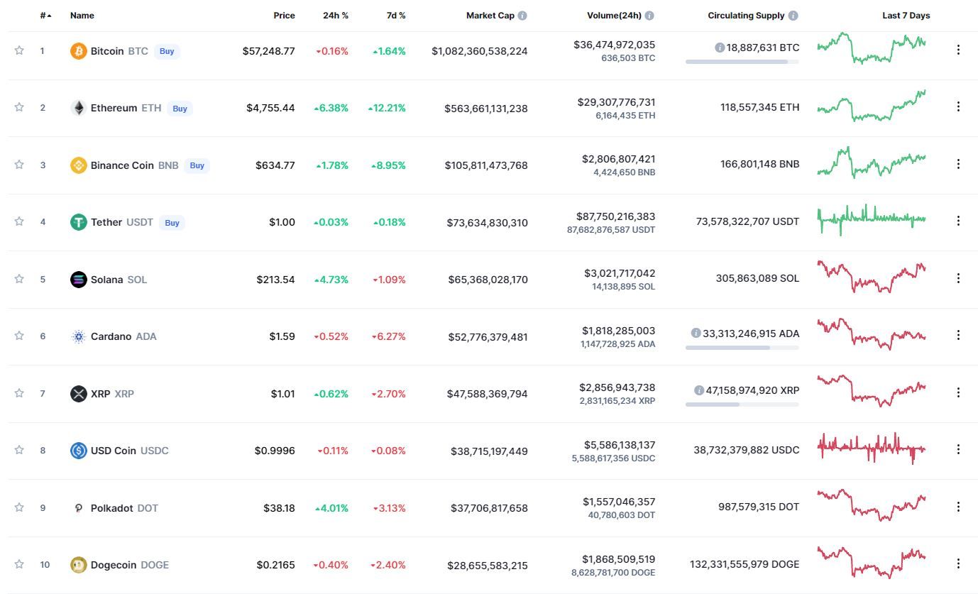 В топ-10 самых капитализированных криптовалют лучший результат за 24 часа (+6,38%) и неделю (+12,21%) зафиксирован у Ethereum. Активнее других терял в цене в течение суток (-0,52%) и последних 7 дней (-6,27%) Cardano.