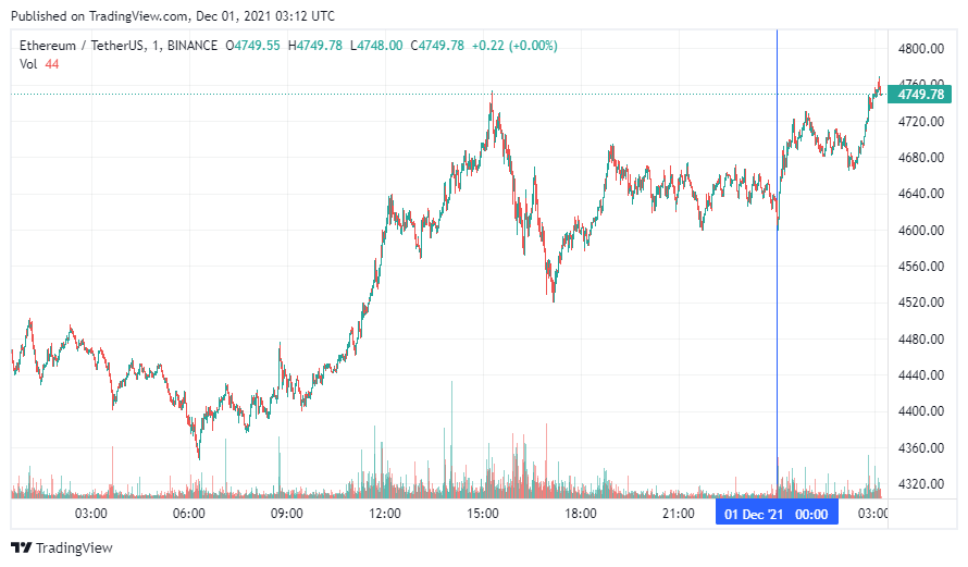 Вторая по капитализации криптовалюта – Ethereum – начала зиму с роста. По состоянию на момент написания новости, монета торгуется по $4749. Напомним, абсолютный максимум стоимости ETH был зафиксирован 10 ноября 2021 года ($4859).