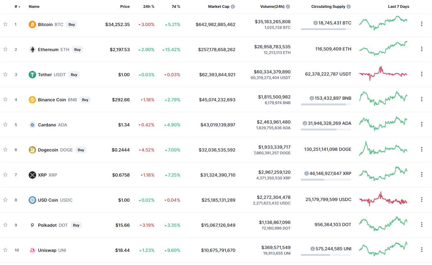 Биткоин (BTC) начал первый день июля с падения. По состоянию на 06:44 (МСК), криптовалюта торгуется по $34 274.