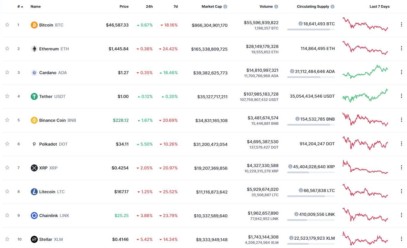 Новая рабочая неделя началась для многих криптовалют из топ-10 рейтинга капитализации ресурса CoinMarketCap с падения. Биткоин, по состоянию на 06:19 (МСК), торгуется по $46 587. За сутки монета подорожала на 0,67%, сохранив, при этом, отрицательную динамику движения в течение недели (-18,16%). На выходных биткоин опускался до $43 241. Напомним, локальный максимум криптовалюты был зафиксирован неделю назад на высоте $58 330. Таким образом, снижение монеты от пика стоимости составило 25%.