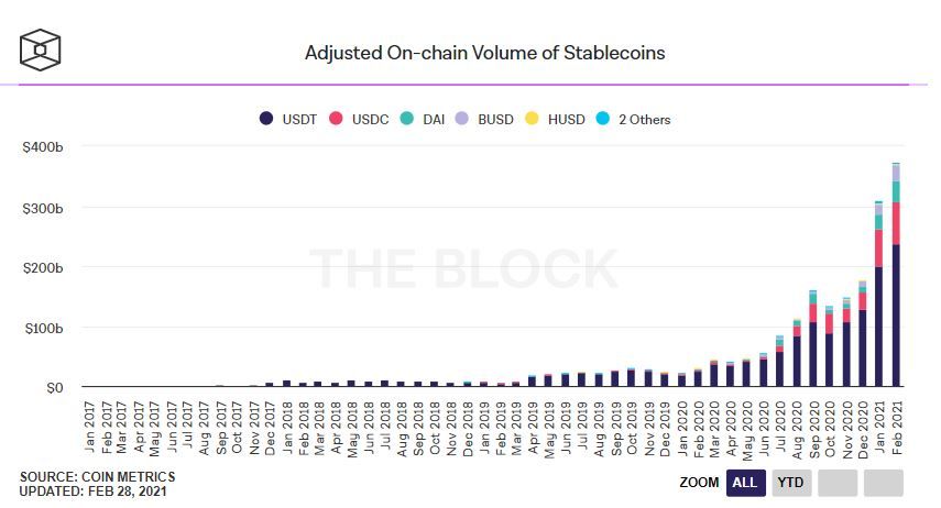 - В феврале объем операций со стейблкоинами обновил максимум. Показатель впервые достиг отметки в $360 млрд. На самый капитализированный стейблкоин – Tether – пришлось 63,5% торгового объема за месяц. Об этом пишет The Block.