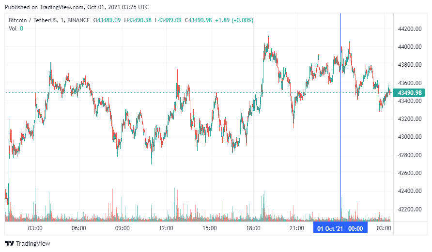 Биткоин (BTC) начал последний день рабочей пятидневки с небольшой коррекции. По состоянию на 06:27 (МСК), криптовалюта торгуется по $43 490. Минимум стоимости биткоина за сутки зафиксирован на уровне $42 787, максимум – на высоте $44 092.
