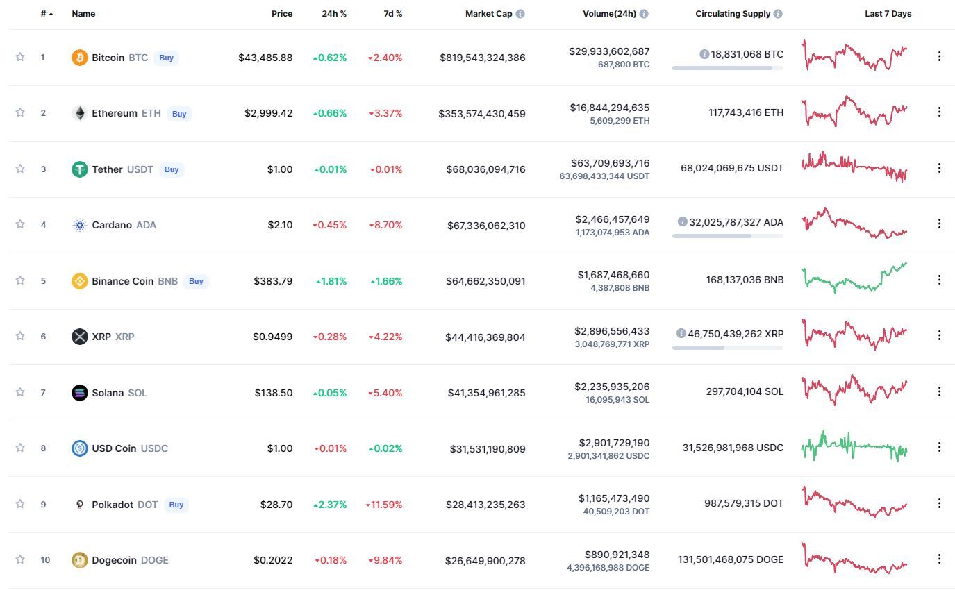 Лучший результат движения за сутки в топ-10 криптовалют продемонстрировал Polkadot (+2,37%), за неделю – Binance Coin (+1,66%). Активнее других в течение 24 часов терял в цене Cardano (-0,45%). В рамках недели наибольшие потери зафиксированы у Polkadot (-11,59%).