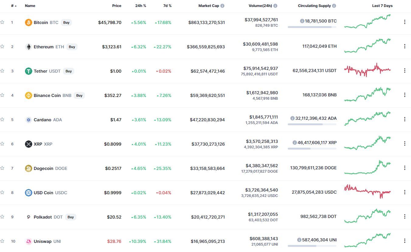 Sponsored SponsoredВ топ-10 самых капитализированных криптовалют все монеты, за исключением стейблкоинов Tether и USD Coin, продемонстрировали позитивную динамику движения за сутки и неделю. Лучший результат за 24 часа (+10,39%) и неделю (+31,84%) зафиксирован у Uniswap.