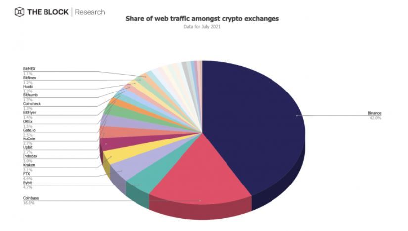 Около 42% веб-трафика криптобирж в июле пришлось на Binance. На втором месте по объему оказалась Coinbase (15.5%), на третьем – Bybit (+4.7%).