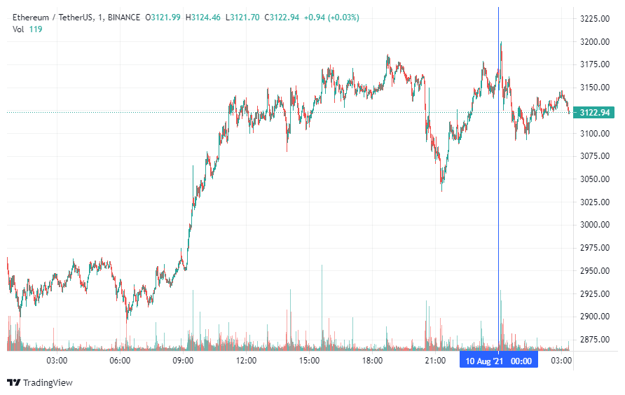 Вторая по капитализации криптовалюта – Ethereum – также начала вторник с бокового движения. По состоянию на момент написания новости, монета торгуется по $3122.