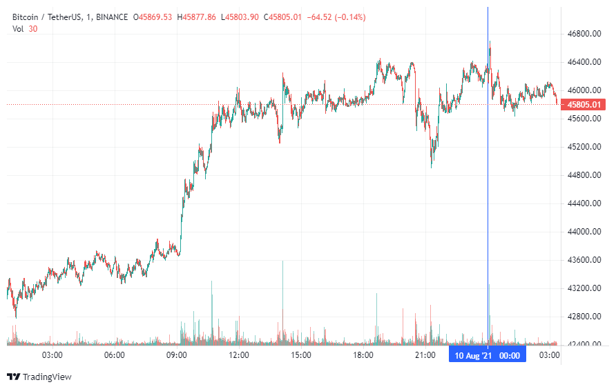 Биткоин (BTC) начал вторник с бокового движения. По состоянию на 06:21 (МСК), криптовалюта торгуется по $45 805. Максимум стоимости биткоина за 24 часа, по данным ресурса CoinMarketCap, был зафиксирован на уровне $46 637.