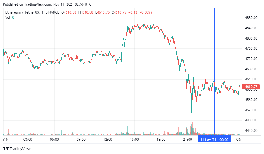 Вторая по капитализации криптовалюта – Ethereum – начала день с бокового движения. По состоянию на момент написания новости ETH торгуется по $4610. Около 11 часов назад Ethereum обновил абсолютный максимум на высоте $4859.