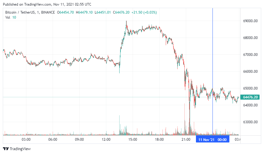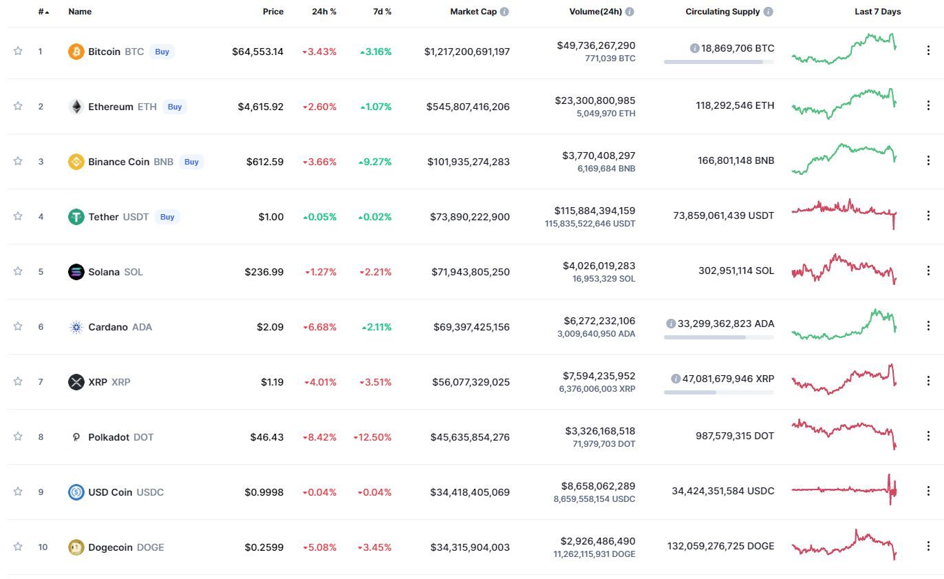 Биткоин (BTC) начал четверг с коррекции. По состоянию на 05:57 (МСК), криптовалюта торгуется по $64 476. Биткоин вышел в коррекцию после обновления максимума на уровне $68 789 около 13 часов назад (по данным ресурса CoinMarketCap) .